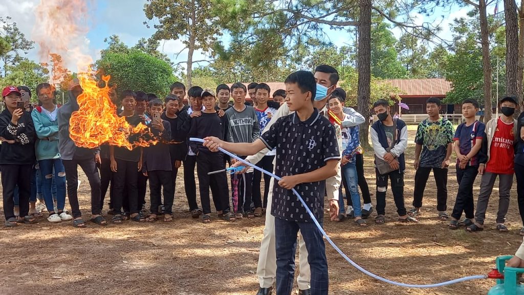 ຈາກນັ້ນ, ກໍໄດ້ມີການສາທິດການນໍາໃຊ້ອຸປະກອນການມອດໄຟຂັ້ນພື້ນຖານ, ການຈຳລອງເວລາມີເຫດການໄຟໄໝ້ຈາກຖັງແກ໊ດໃຫ້ບັນດາຜູ້ເຂົ້າຮ່ວມຮັບຊົມ ແລະ ຈັດຕັ້ງປະຕິບັດຕົວຈິງໃນການນຳໃຊ້ບັ້ງມອດໄຟ, ການມອດໄຟຈາກຖັງແກ໊ດ, ການແກ້ໄຂ ສະກັດກັ້ນເຫດການໄຟໄໝ້ ຂັ້ນພື້ນຖານກ່ອນເຈົ້າໜ້າທີ່ດັບເພີງມາຊ່ວຍ